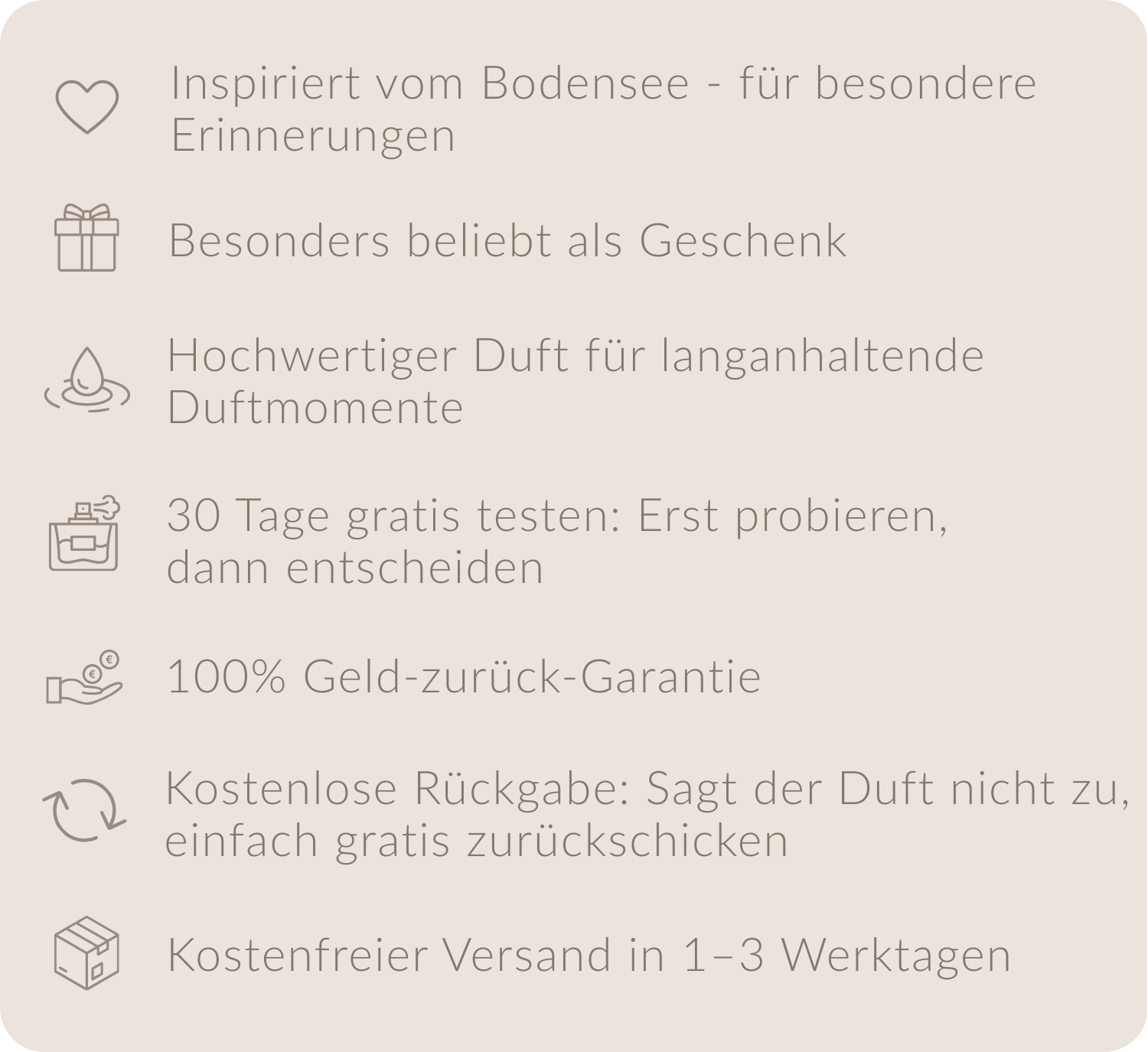Ich habe den Duft an meinen Mann verschenkt und wir sind sehr zufrieden mit dem Produkt - wir lieben den Bodensee und das Design auf der Flasche!